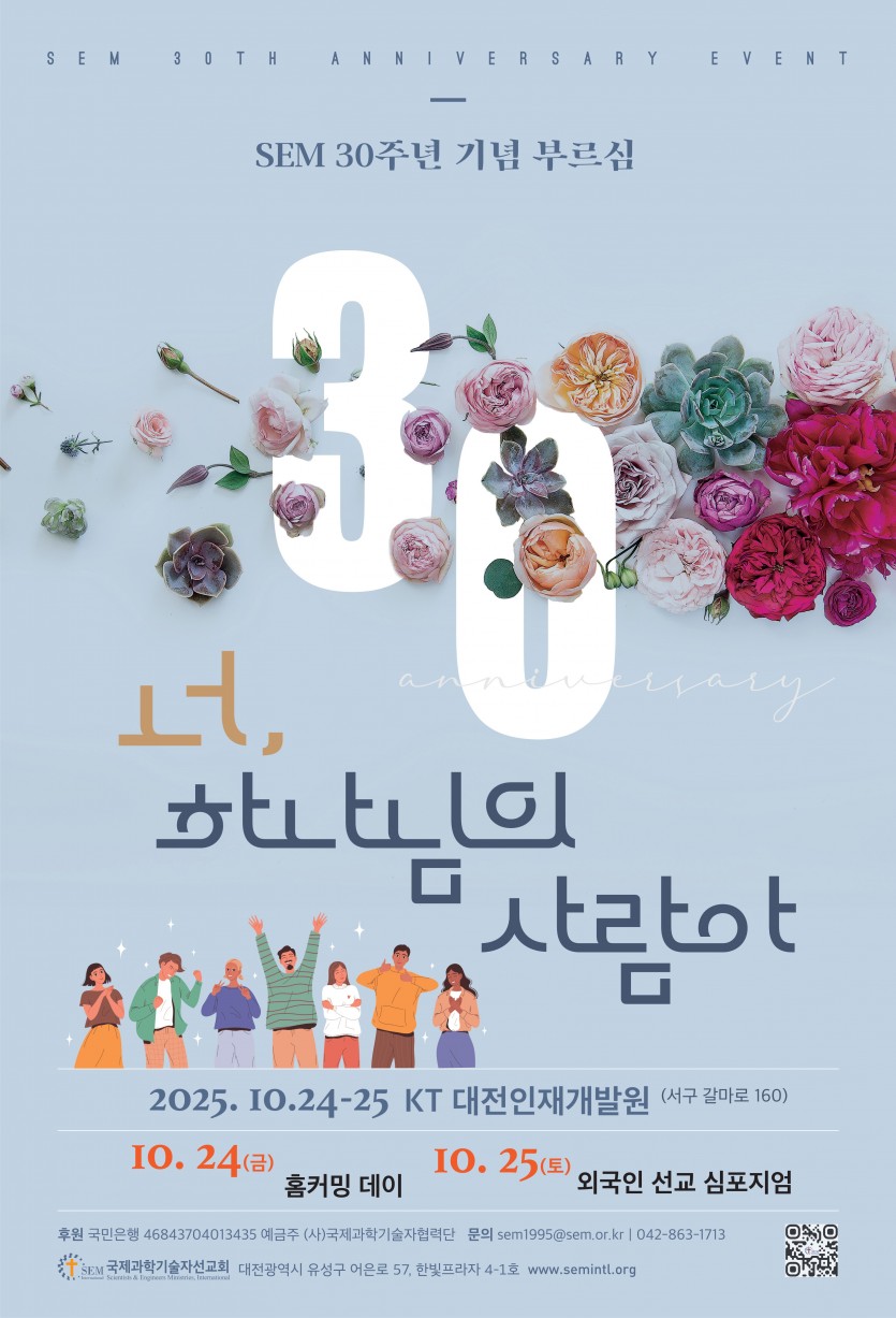 올해로 30주년을 맞이한 아름다운 SEM 공동체의 생일을 함께 축하하며, 믿음의 길을 걸어가는 이들이 서로를 위로하고 격려하는 자리, 또 이 땅의 외국인들을 더욱 사랑하며 천국 복음을 효과적으로 전할 지혜를 나누는 자리를 마련했습니다.